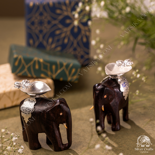 Silver Deepas on a Rosewood elephant for Lakshmi Devi